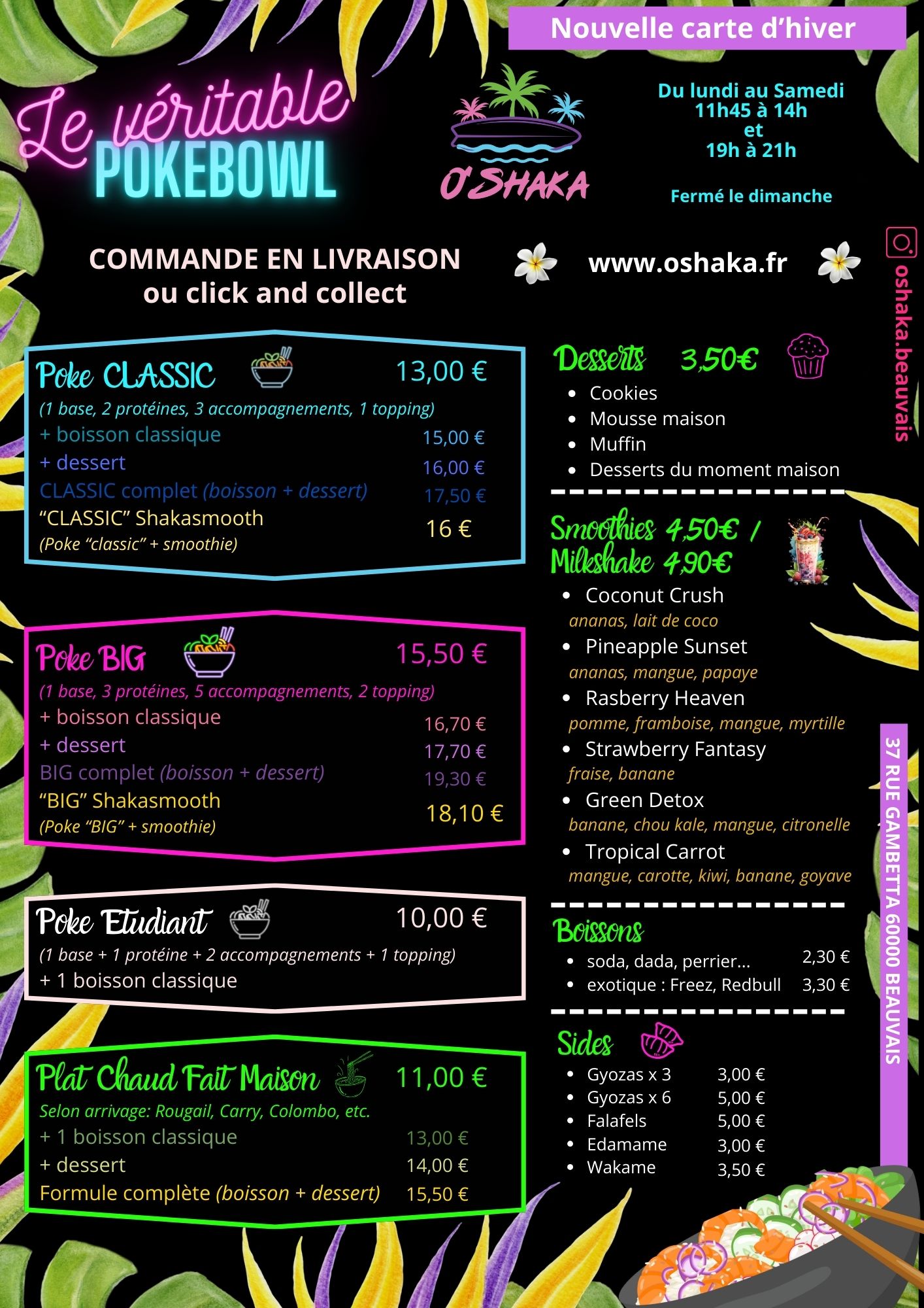 Si vous préférez la livraison, optez pour une commande via Uber Eats. Vous pouvez également choisir un pokebowl à emporter via notre site internet et à récupérer directement chez O'SHAKA. Nous ne sommes pas dans la capacité de prendre des commandes par téléphone.
